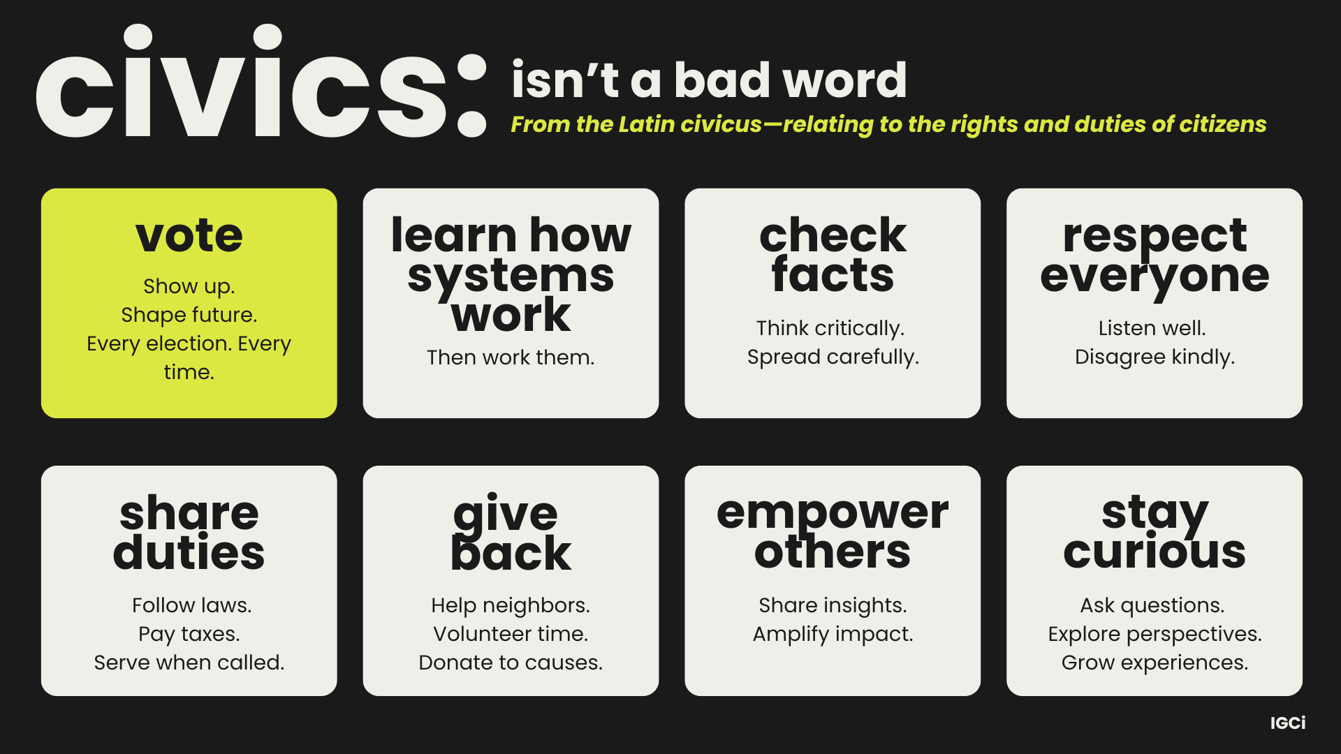 Ask questions. Listen well. Disagree kindly. Civics is ultimately about treating people like humans — even when you don’t see the world the same way.