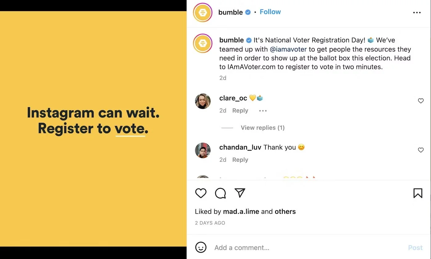 Why it worked: The company placed civic action inside an experience employees and users already trusted. The tone remained friendly and aligned with Bumble’s brand.